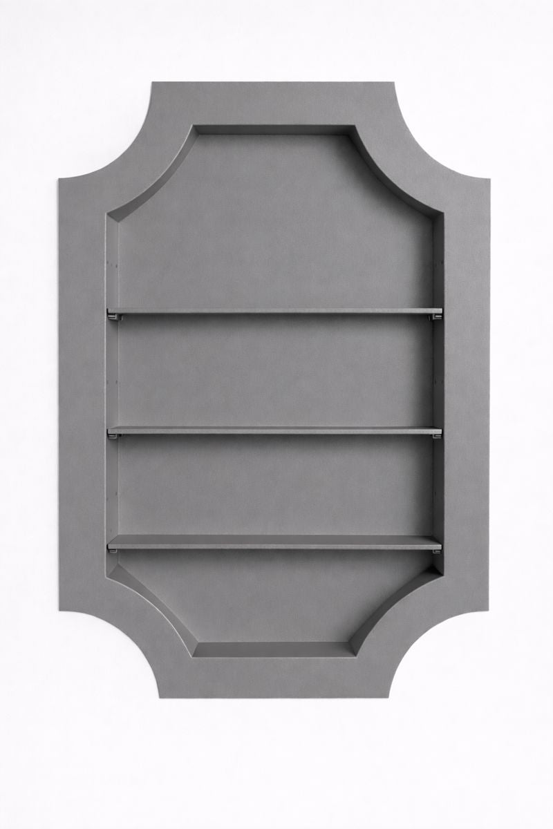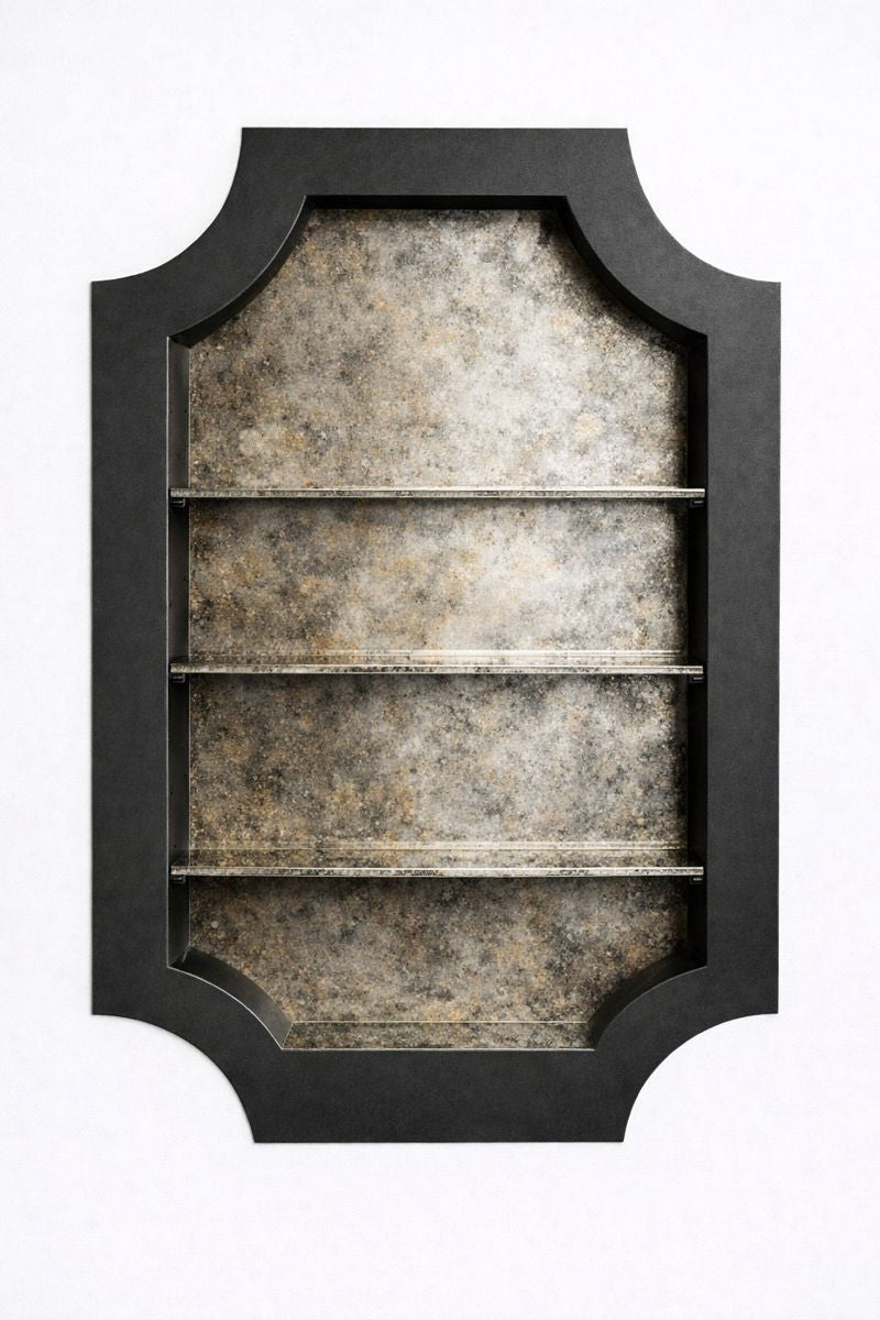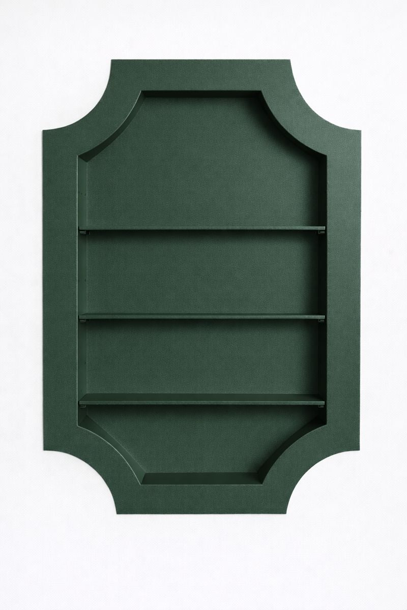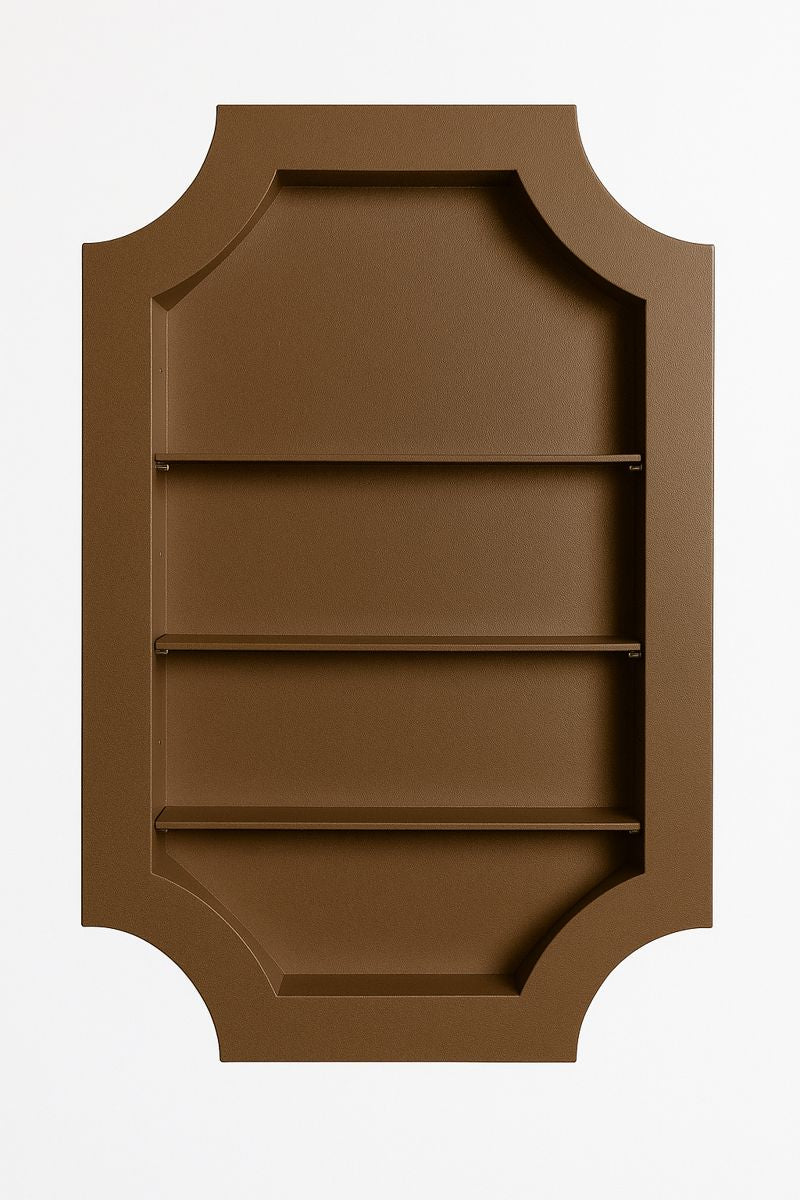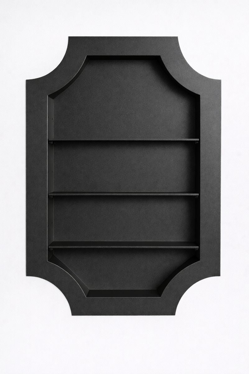 Crafted from precision-welded steel and finished in your powder-coat of choice, The Crest introduces a deliberate material contrast, allowing it to read as an inserted architectural element rather than a continuation of the wall. Designed to fit cleanly between standard studs, it transforms unused wall cavities into purposeful design moments, with optional, adjustable shelving and the ability to incorporate custom wallpaper or specialty backdrops—an elevated detail that allows each piece to be tailored to its setting, adding depth, texture, and a distinctly bespoke finish.
